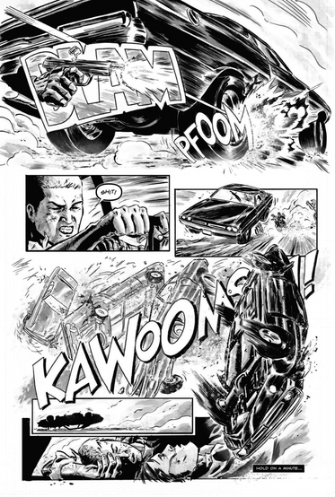 Identical twin orphans, Jack and John James terrorize the southern US highways to wrap up unfinished business: Hunt down and kill the bikers that butchered their parents fifteen years earlier! Starting with a massacre of unsavories at the Sunshine Diner in Kentucky the boys rip-roar their Dodge Challenger through 5 issues of mechanics’ garages, death-cults, drug-dens all the way to prison in Louisiana. But having a hard time was always part of the plan. If they can survive state police from the past and present, and a shady woman who seems to offer help, brotherly spats and good-old-fashioned violent bikers, they may get their revenge and come out of it alive. The real question is, will their relationship withstand the truth of what got their parents killed in the first place? Alongside that come furious car crashes, grindhouse violence, classic rock and roll, and a few road-beers to wash it all down. Rowdy, fast-paced and in glorious black and white, The Brothers James shows two brothers hanging on with white knuckles as they speed toward oblivion and try to take every offending member of the murderous LUCKY DEVILS with them. But it can’t all be pedal to the metal, now can it? Between twists, turns, and double crosses. Women with secret motives, blood cults and cops that can’t be trusted, The Brothers James, keeps your butt in the seat and your head spinning ‘til the bitter end.